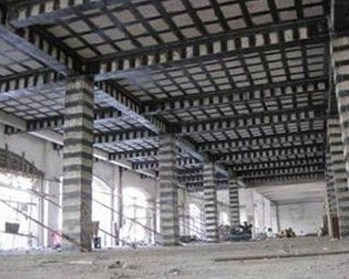 幹式外包鋼法 ,綜合耐溫好、加固件加固後承載力大幅度提高、整體性強、可靠性高、工藝簡便,工期短、對周圍生產環境影響小。